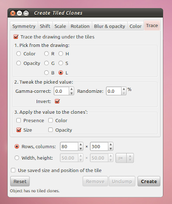 The Trace tab is where the magic happens. Be sure to select "Trace the drawing under the tiles" to turn the effect on. After that, there are 3 simple steps: 1) get a value from the source image, 2) do some optional processing on that number and 3) apply the final value to some attribute of the clone.